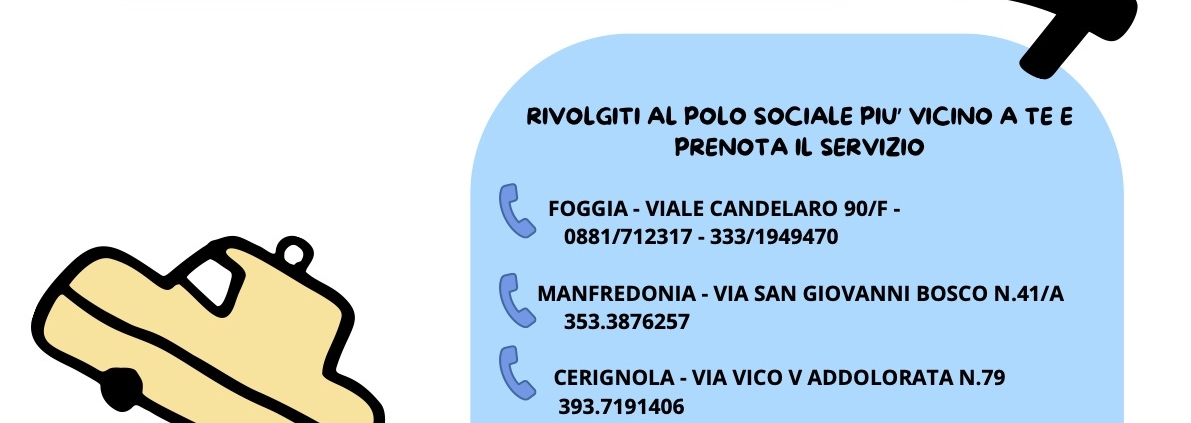 Il servizio dispone di due mezzi, uno dedicato alla zona sud della Provincia di Foggia (Foggia/Manfredonia/Cerignola) e l’altro dedicato alla zona nord (Foggia/San Severo/Lucera). Ciascuno dei due taxi prevede a bordo la presenza di un autista e di un mediatore linguistico/culturale per offrire un effettivo accompagnamento e supporto.