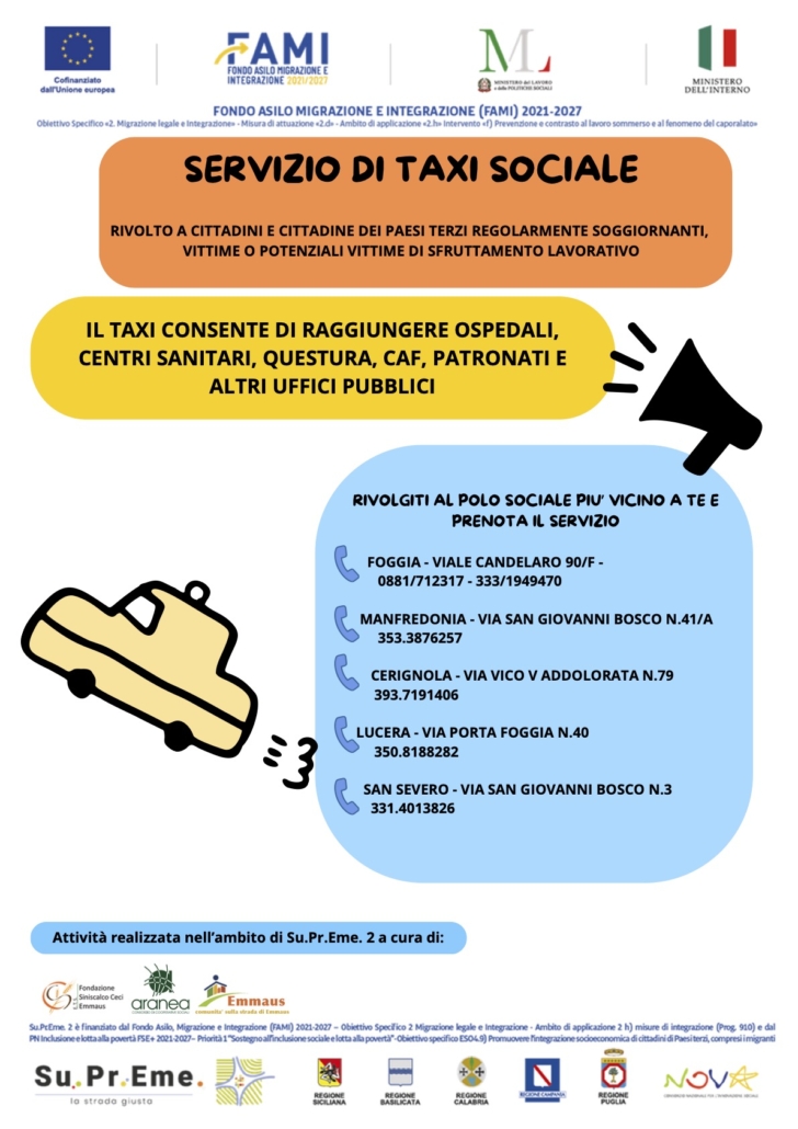 Come ente capofila, la Fondazione Siniscalco Ceci – Emmaus assieme al Consorzio Aranea e all’Associazione Emmaus, ha attivato questo importante servizio di supporto alla mobilità, per promuovere l’accesso ai servizi territoriali dei cittadini e cittadine dei paesi terzi regolarmente soggiornanti, vittime o potenziali vittime di sfruttamento lavorativo. Il Taxi sociale, infatti, consente di raggiungere ospedali, centri sanitari, questura, Caf, patronati e altri uffici pubblici.